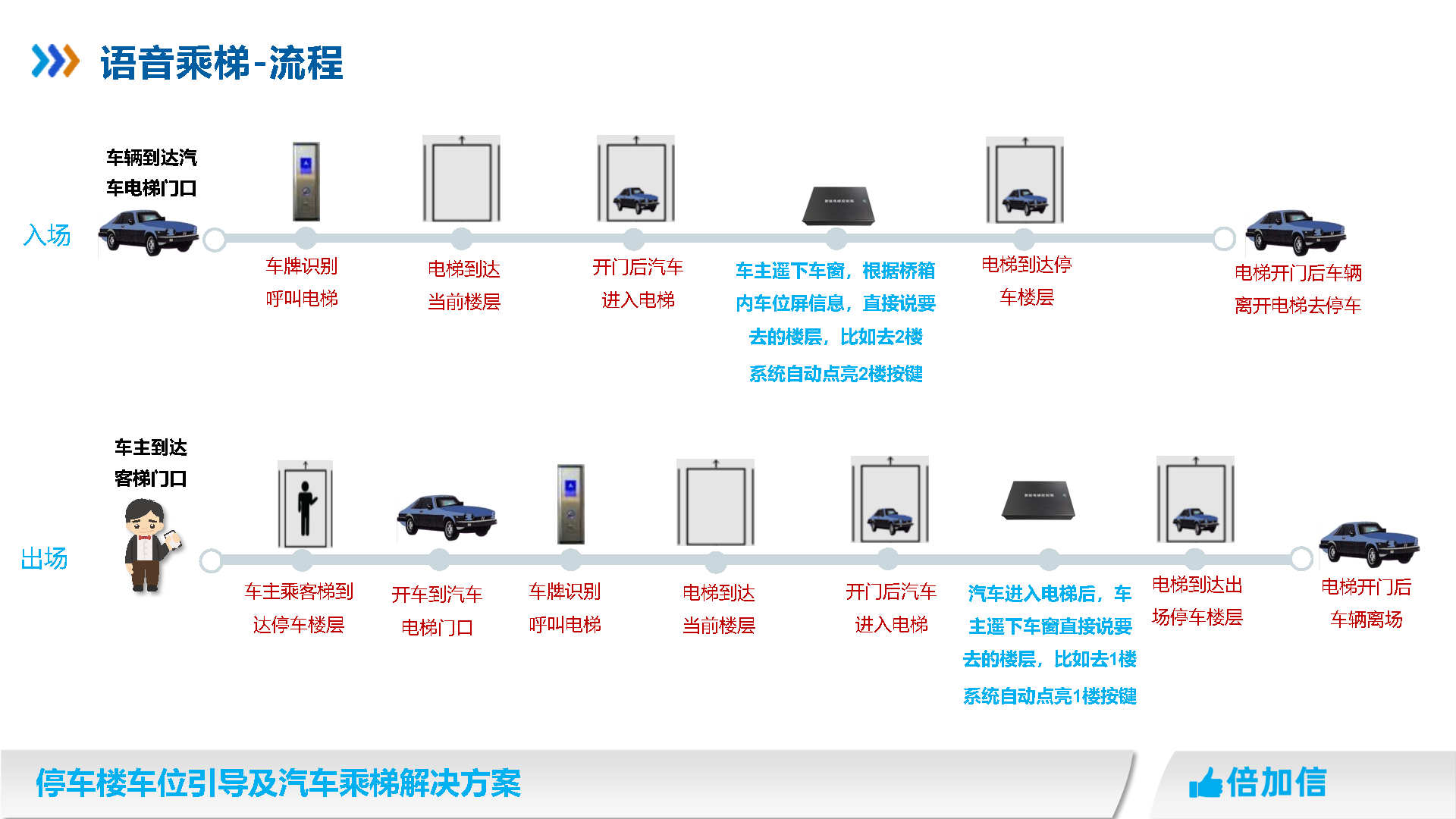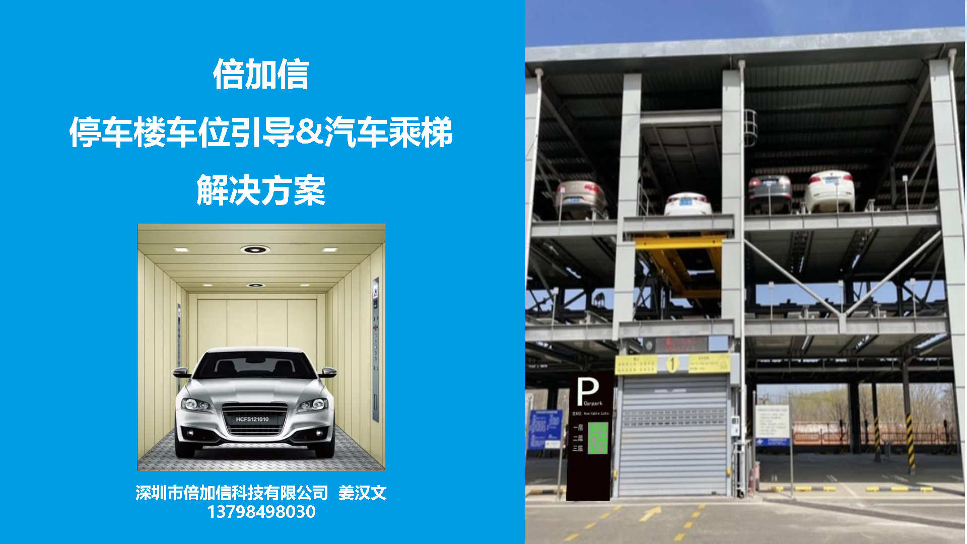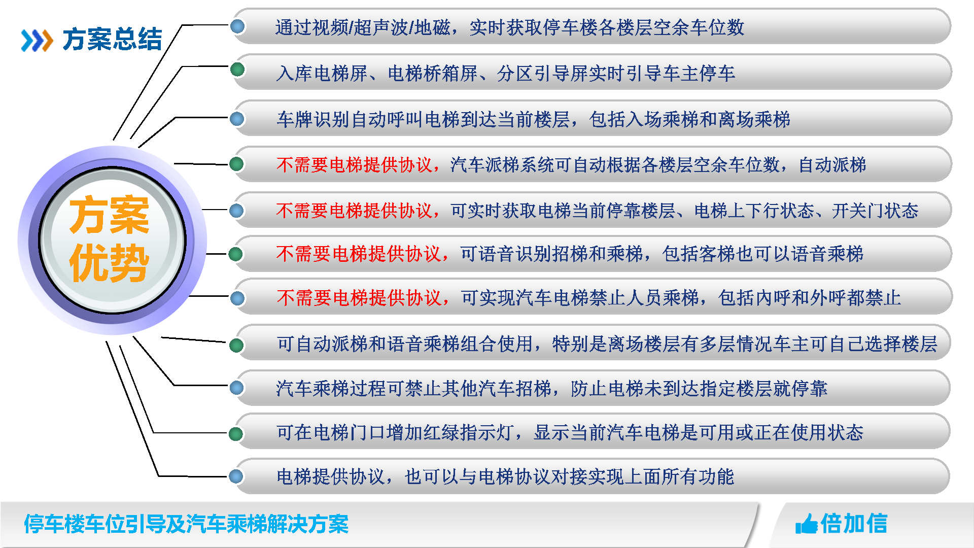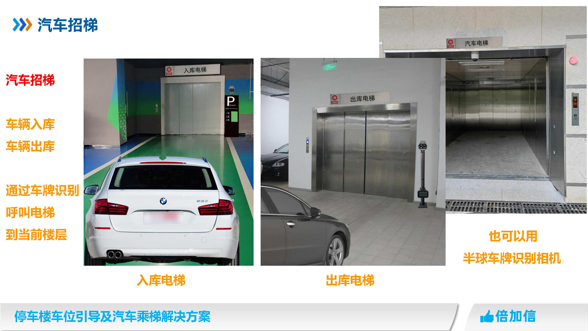 倍加信汽車乘梯系統方案優勢 1、通過視頻/超聲波/地磁,實時獲取停車樓各樓層空余車位數/ 2、入庫電梯屏、電梯橋箱屏、分區引導屏實時引導車主停車 3、車牌識別自動呼叫電梯到達當前樓層,包括入場乘梯和離場乘梯 4、不需要電梯提供協議,汽車派梯系統可自動根據各樓層空余車位數,自動派梯 5、不需要電梯提供協議,可實時獲取電梯當前?繕菍印㈦娞萆舷滦袪顟B、開關門狀態 6、不需要電梯提供協議,可語音識別招梯和乘梯,包括客梯也可以語音乘梯 7、不需要電梯提供協議,可實現汽車電梯禁止人員乘梯,包括內呼和外呼都禁止 8、可自動派梯和語音乘梯組合使用,特別是離場樓層有多層情況車主可自己選擇樓層 9、汽車乘梯過程可禁止其他汽車招梯,防止電梯未到達指定樓層就? 10、可在電梯門口增加紅綠指示燈,顯示當前汽車電梯是可用或正在使用狀態 11、電梯提供協議,也可以與電梯協議對接實現上面所有功能