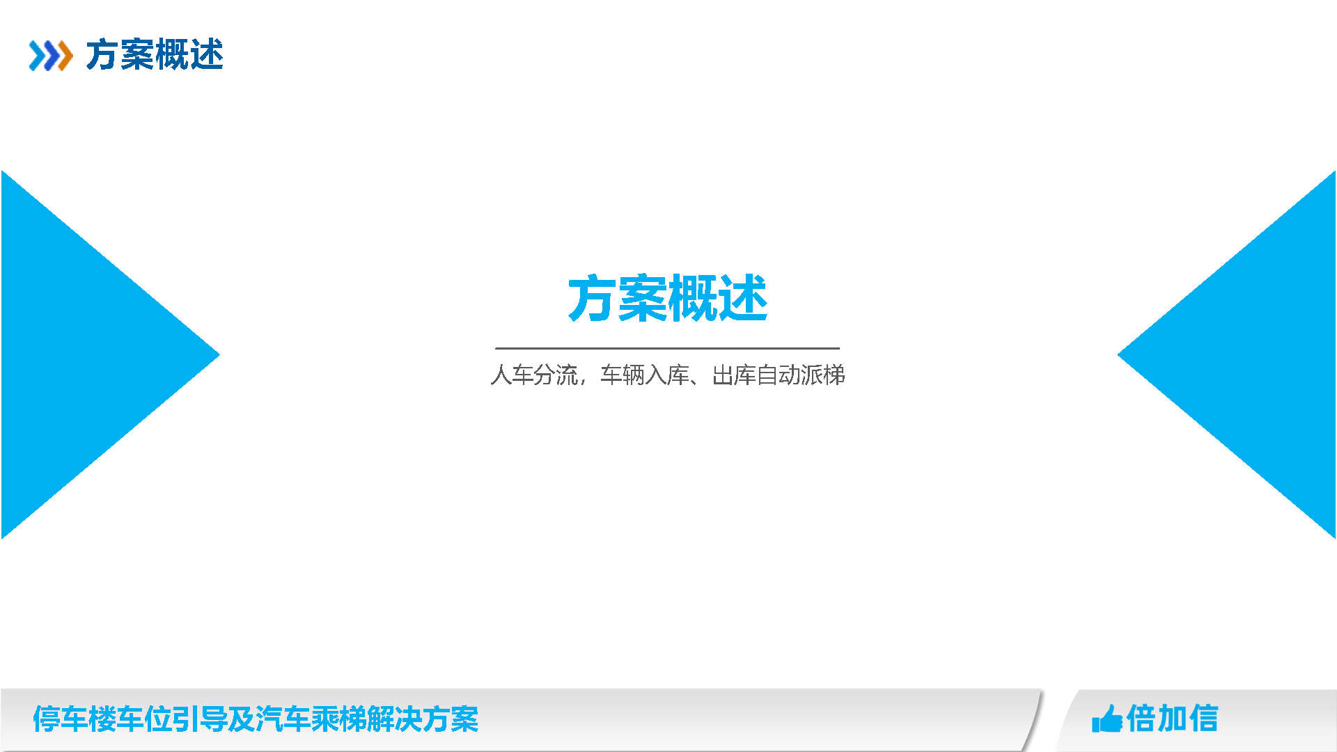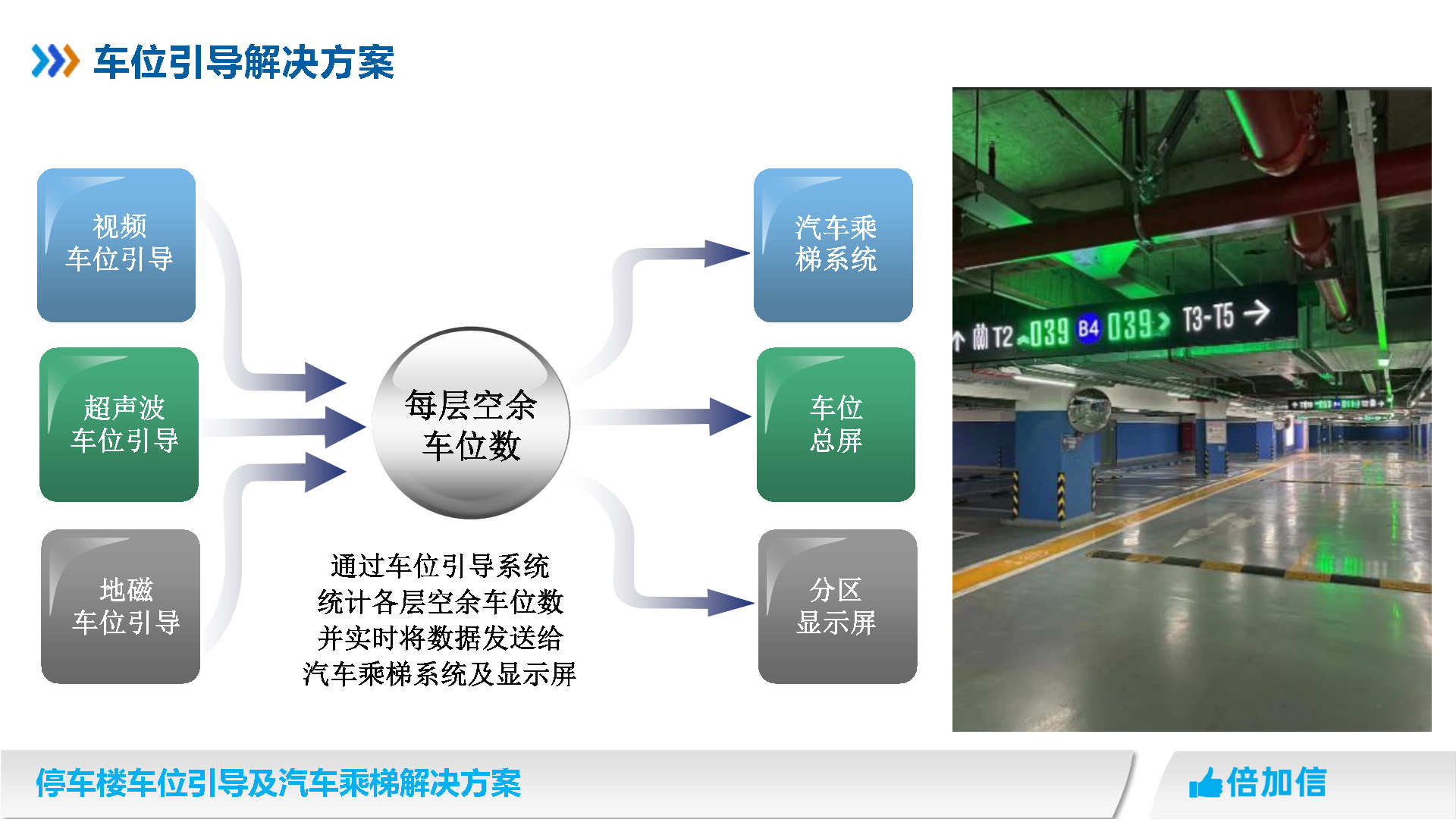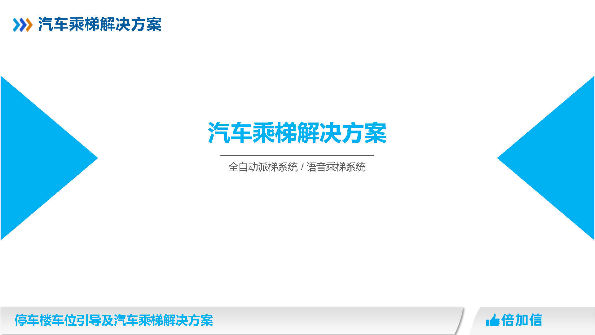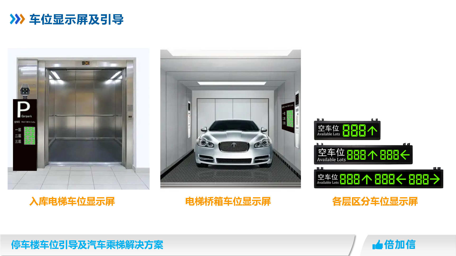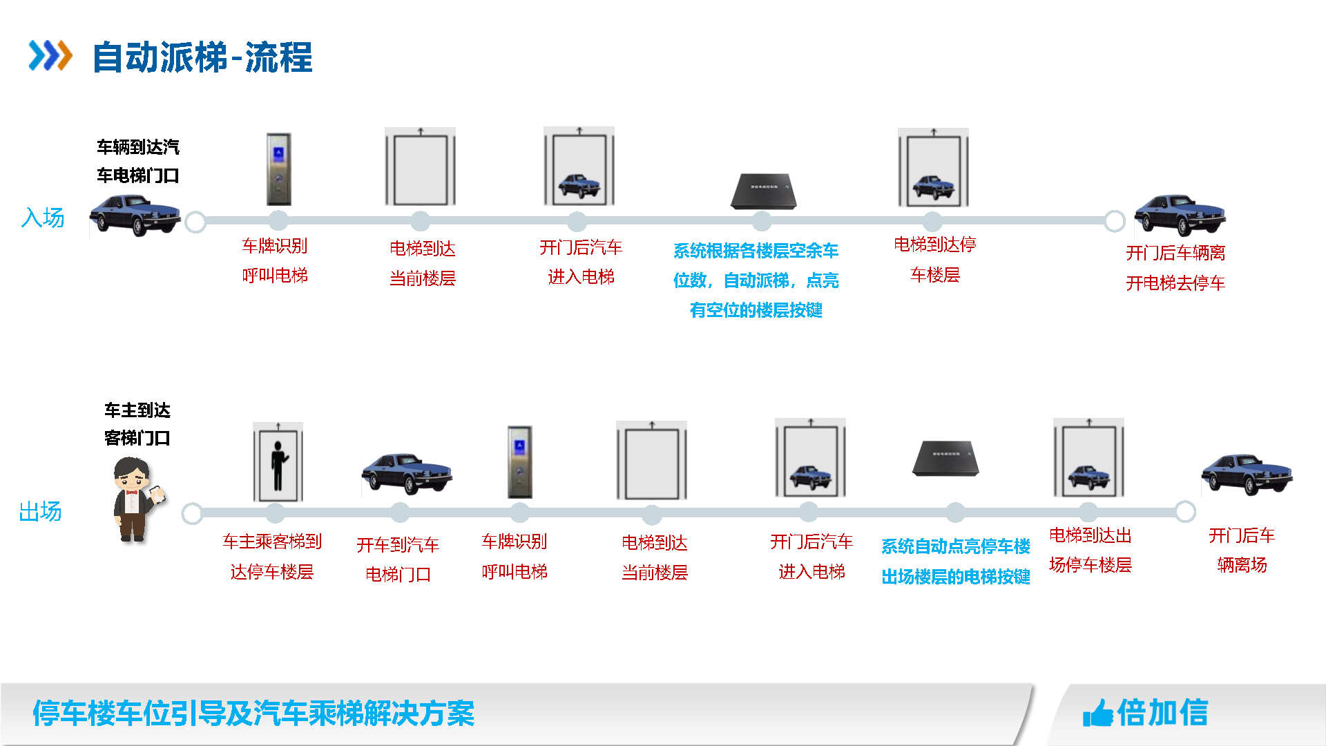 倍加信汽車乘梯系統方案優勢 1、通過視頻/超聲波/地磁,實時獲取停車樓各樓層空余車位數/ 2、入庫電梯屏、電梯橋箱屏、分區引導屏實時引導車主停車 3、車牌識別自動呼叫電梯到達當前樓層,包括入場乘梯和離場乘梯 4、不需要電梯提供協議,汽車派梯系統可自動根據各樓層空余車位數,自動派梯 5、不需要電梯提供協議,可實時獲取電梯當前?繕菍印㈦娞萆舷滦袪顟B、開關門狀態 6、不需要電梯提供協議,可語音識別招梯和乘梯,包括客梯也可以語音乘梯 7、不需要電梯提供協議,可實現汽車電梯禁止人員乘梯,包括內呼和外呼都禁止 8、可自動派梯和語音乘梯組合使用,特別是離場樓層有多層情況車主可自己選擇樓層 9、汽車乘梯過程可禁止其他汽車招梯,防止電梯未到達指定樓層就? 10、可在電梯門口增加紅綠指示燈,顯示當前汽車電梯是可用或正在使用狀態 11、電梯提供協議,也可以與電梯協議對接實現上面所有功能