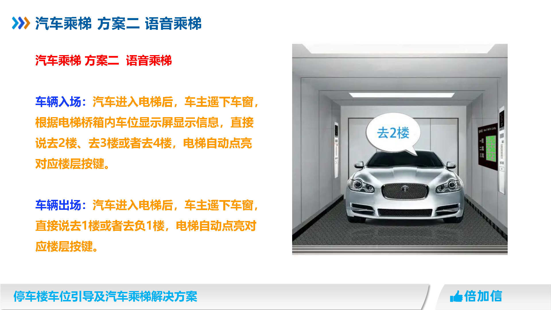 汽車乘梯 方案二 語音乘梯 車輛入場:汽車進入電梯后,車主遙下車窗,根據電梯橋箱內車位顯示屏顯示信息,直接說去2樓、去3樓或者去4樓,電梯自動點亮對應樓層按鍵。 車輛出場:汽車進入電梯后,車主遙下車窗,直接說去1樓或者去負1樓,電梯自動點亮對應樓層按鍵。