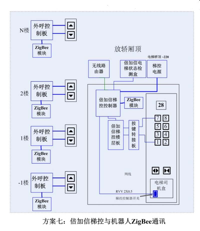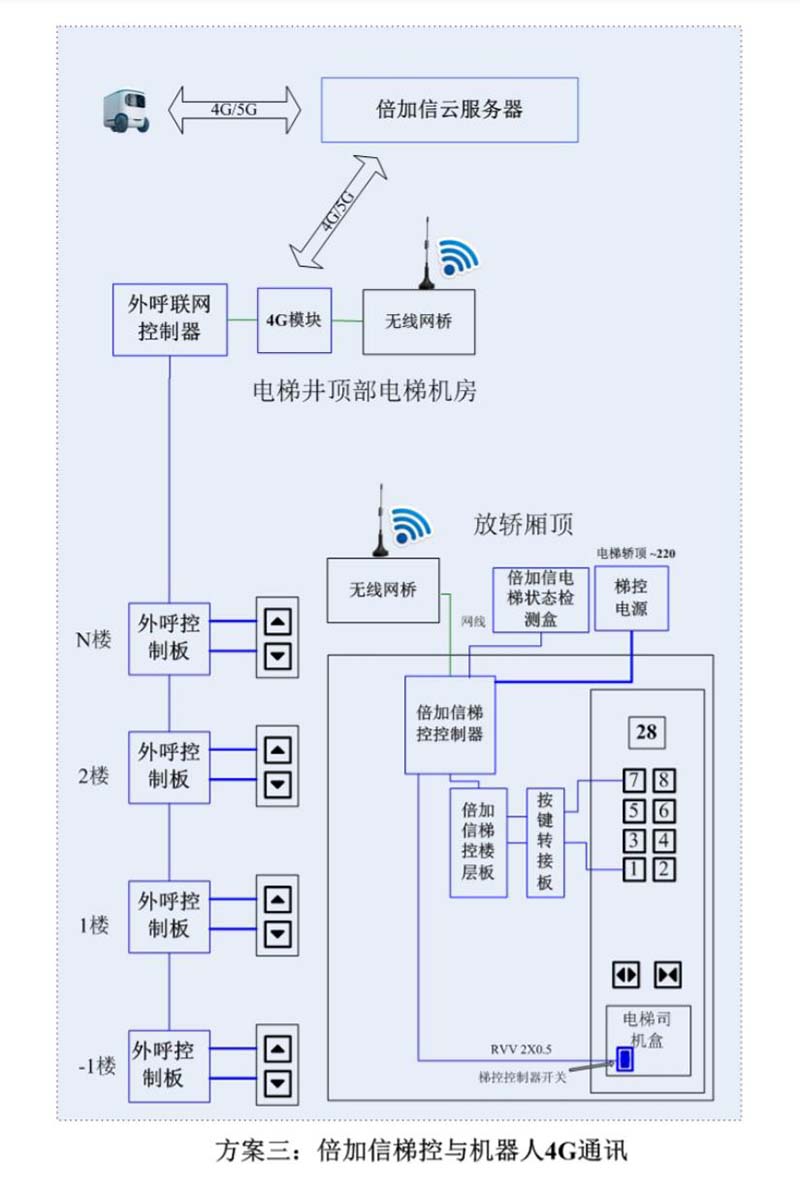 (1)機器人在電梯外,通個Wifi或4G網絡發送指令給倍加信梯控平臺,倍加信梯控云平臺收到指令后,將指令發給倍加信梯控系統,倍加信梯控系統自動點亮上樓或下樓按鍵,實現呼梯功能。
