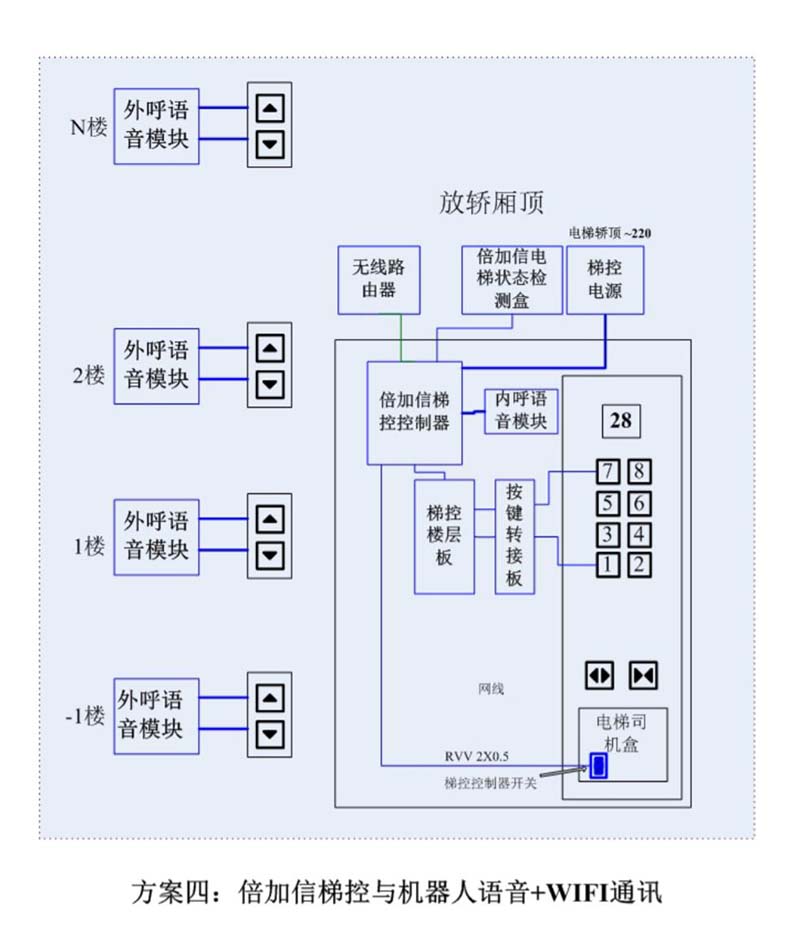 (1)機器人進入電梯后,通個Wifi或4G網絡發送指令給倍加信梯控云平臺,倍加信梯控云平臺收到指令后,將指令發給倍加信梯控系統,倍加信梯控系統自動點亮對應樓層按鍵,比如發去6樓指令,則6樓按鍵自動點亮,電梯送機器人員到6樓。