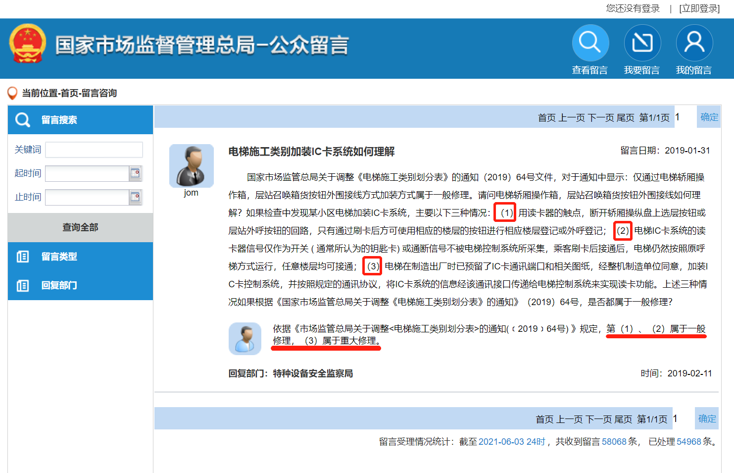 2、國家市場監督管理總局回復加裝梯控哪種是一般修理和重大修理