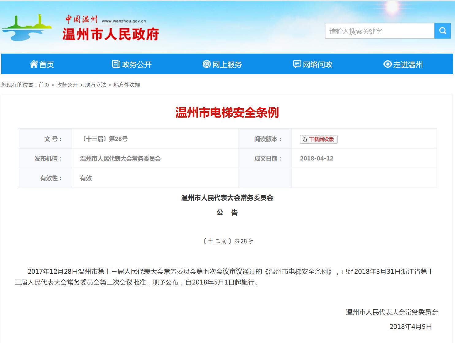 2017年12月28日溫州市第十三屆人民代表大會常務委員會第七次會議審議通過的《溫州市電梯安全條例》,已經2018年3月31日浙江省第十三屆人民代表大會常務委員會第二次會議批準,現予公布,自2018年5月1日起施行。