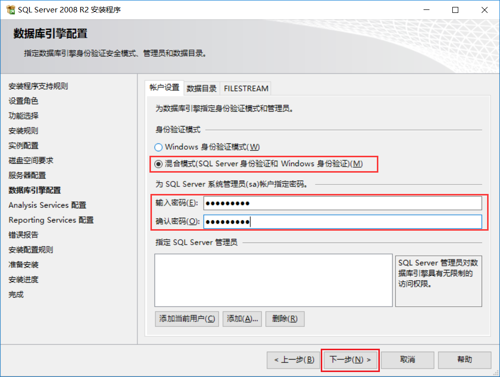 選擇混合模式,輸入密碼,點下一步